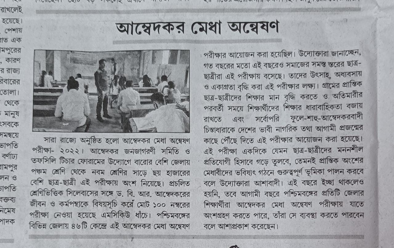 The 2nd Ambedkar Talent Search Examination (ATSE) :- “Ambedkar Medha Anweshan Pariksha – 2022” was held on the 18th December, 2022. Across the state, more than 6200 students of class V to IX participated in the examination at 53 centres in more than 12 Districts of West Bengal under the initiative of Ambedkar Janajagarani Samiti and Tapashili Teachers Forum.Out of total 100 marks, 20 MCQ type questions of one mark each were dedicatedly on life and works of Dr. B.R. Ambedkar. The rest 80 MCQ type questions of one mark each were on class-based syllabus. According to the organisers, students from all walks of life have participated in this exam in the 2nd year just like the first year.